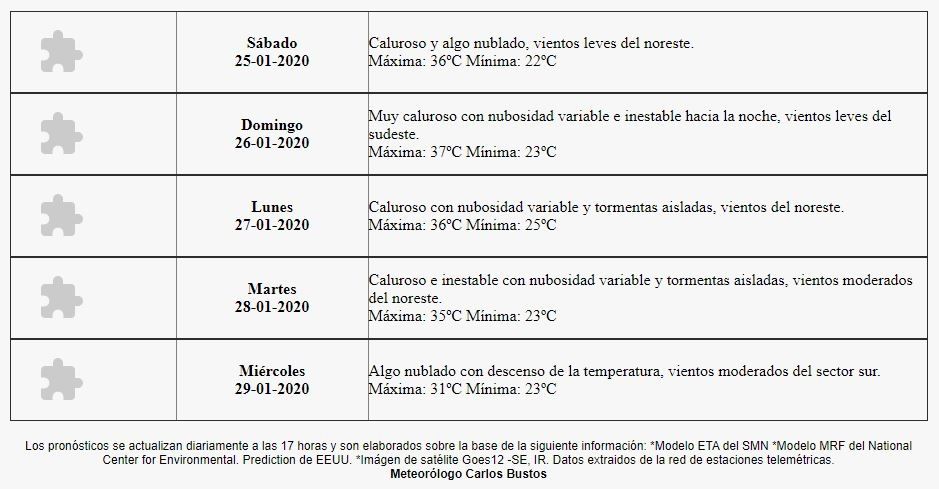 "Caluroso y algo nublado, vientos leves del noreste", indica el pronóstico del sábado. "Muy caluroso con nubosidad variable e inestable hacia la noche, vientos leves del sudeste", el del domingo.