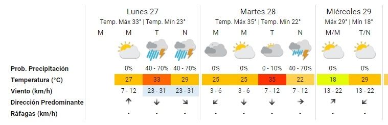 Según advirtió el órgano meteorológico en un comunicado, se producirán algunas tormentas intensas. "Se espera que nuevamente a partir de la tarde de hoy lunes 27 vuelvan a formarse lluvias y tormentas sobre el área de cobertura" que incluye Catamarca, centro y oeste de Jujuy, La Rioja, centro y norte de Mendoza, centro y oeste de Salta, San Juan y Tucumán. "Algunas de estas pueden ser localmente fuertes con abundante caída de agua en cortos periodos, rafagas, ocasional caida de granizo e intensa actividad eléctrica. No se descartan mejoramientos temporarios principalmente durante la mañana", remarca el texto.