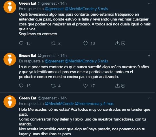 "Lo que podemos contarte es que nunca sucedió algo así en nuestros 9 años y que ya identificamos el proceso de esa partida exacta tanto en el productor como en nuestra cocina para seguir analizando", agregaron en el siguiente tuit.