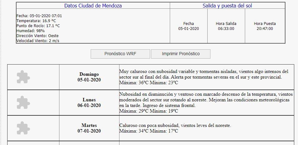 Según Contingencias Climáticas, este primer domingo del 2020 estará "muy caluroso con nubosidad variable y tormentas aisladas, vientos algo intensos del sector sur al final del día". y advierte también que podrían registrarse tormentas severas en el Sur y Este provincial, tal como ocurrió el día sábado.