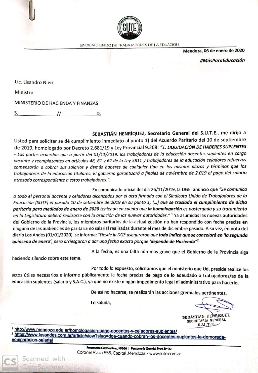 Esta vez, se presentó formalmente un reclamo en el Ministerio de Hacienda para que se concrete el pago adeudado del salario y el aguinaldo de los suplentes.