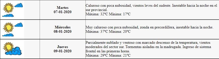 "Muy caluroso con poca nubosidad, zonda en precordillera, inestable hacia la noche. Máxima: 37ºC, Mínima: 20ºC", reza la estimación para mañana miércoles.