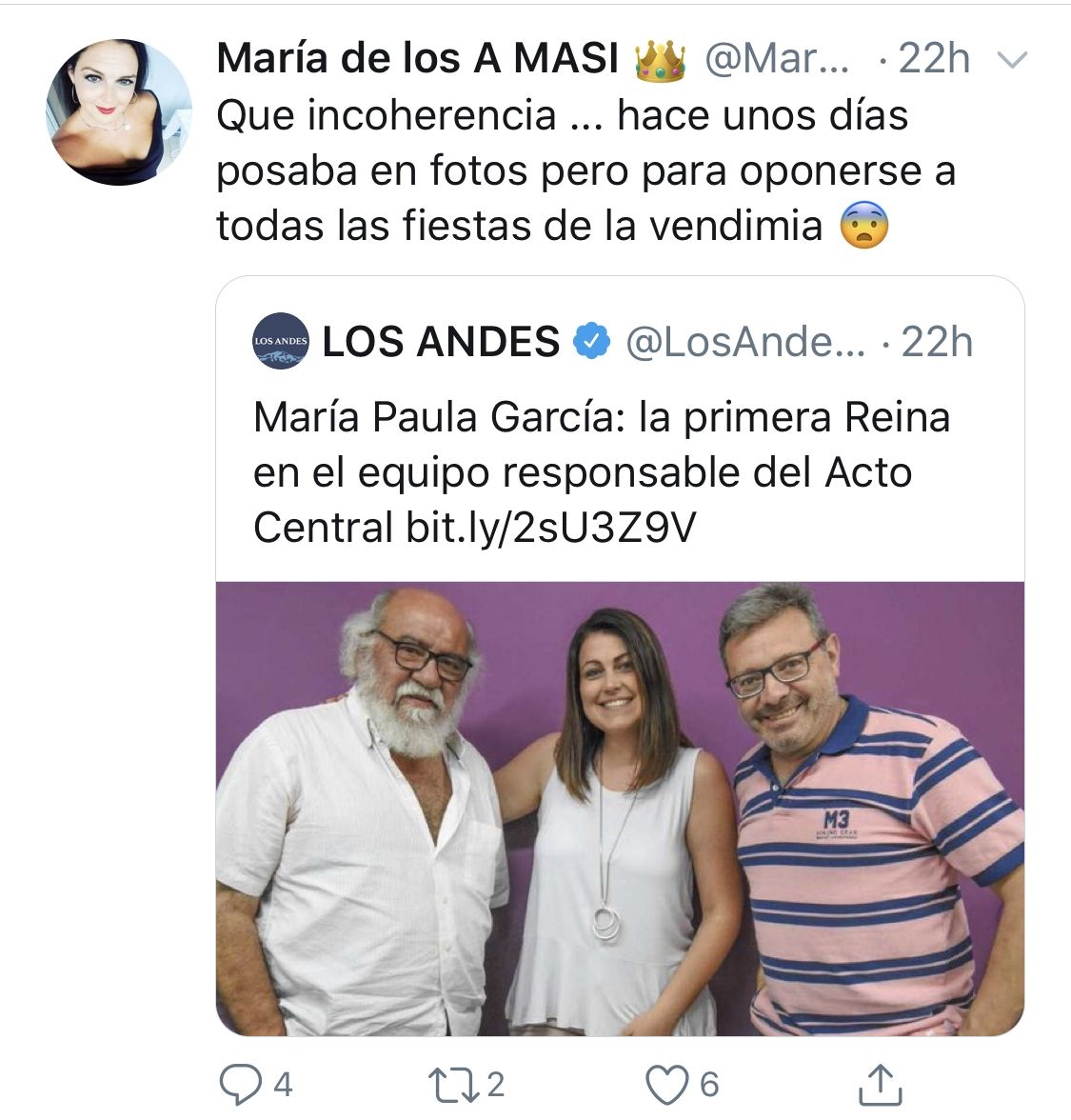 “Que incoherencia ... Hace unos días posaba en fotos pero para oponerse a todas las fiestas de la Vendimia”, fue la frase que demostraba la postura crítica de Masi en su cuenta de Twitter; a propósito de una nota periodística de diario Los Andes en la cual María Paula García fue protagonista debido a su compromiso con el armado y la puesta en marcha de la fiesta de este año.