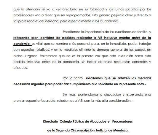 El Directorio del Colegio de Abogados de la Segunda Circunscripción Judicial, por su parte, emitió un comunicado manifestando la "profunda preocupación" por la inhabilidad del GEJUAS de Familia de San Rafael hasta el 23 de octubre y solicitando que se arbitren "las medidas necesarias para regularizar la atención a profesionales y evitar que se repitan situaciones que afecten la prestación del servicio de Justicia en dicho fuero".