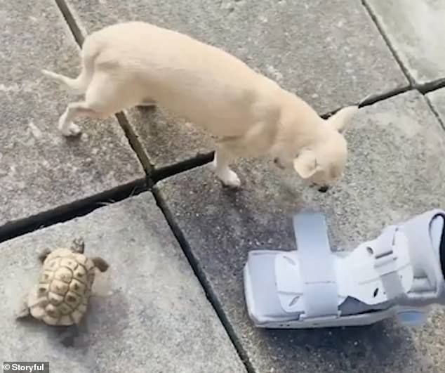 La tortuga, llamada Tuk, asustó al pequeño perro, que intenta escaparse, pero no toma en cuenta la velocidad que puede alcanzar el quelonio.