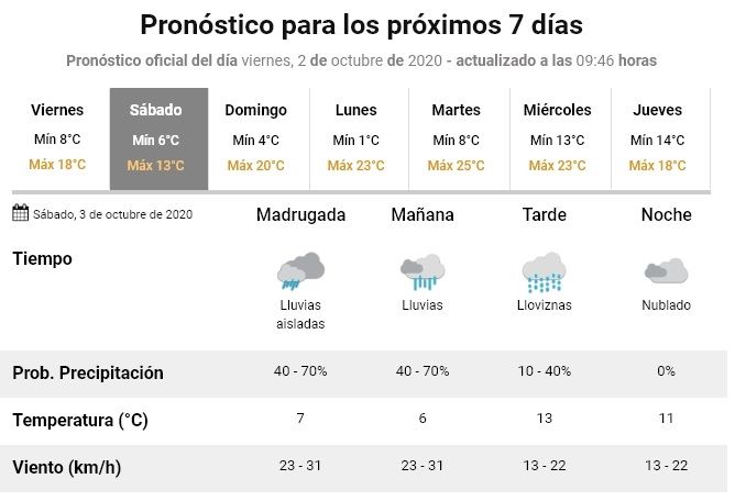 El domingo, en tanto, mejorarán un poco las condiciones climáticas, con una mínima de 4º y una máxima de 20º. No se esperan precipitaciones por ahora, pero sí un cielo nublado.