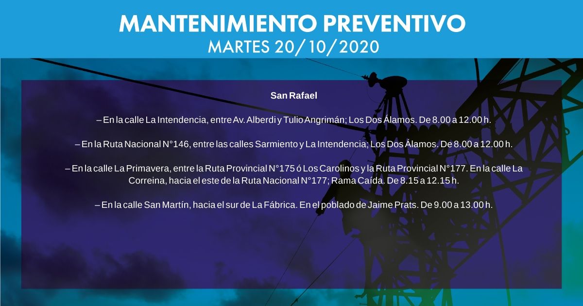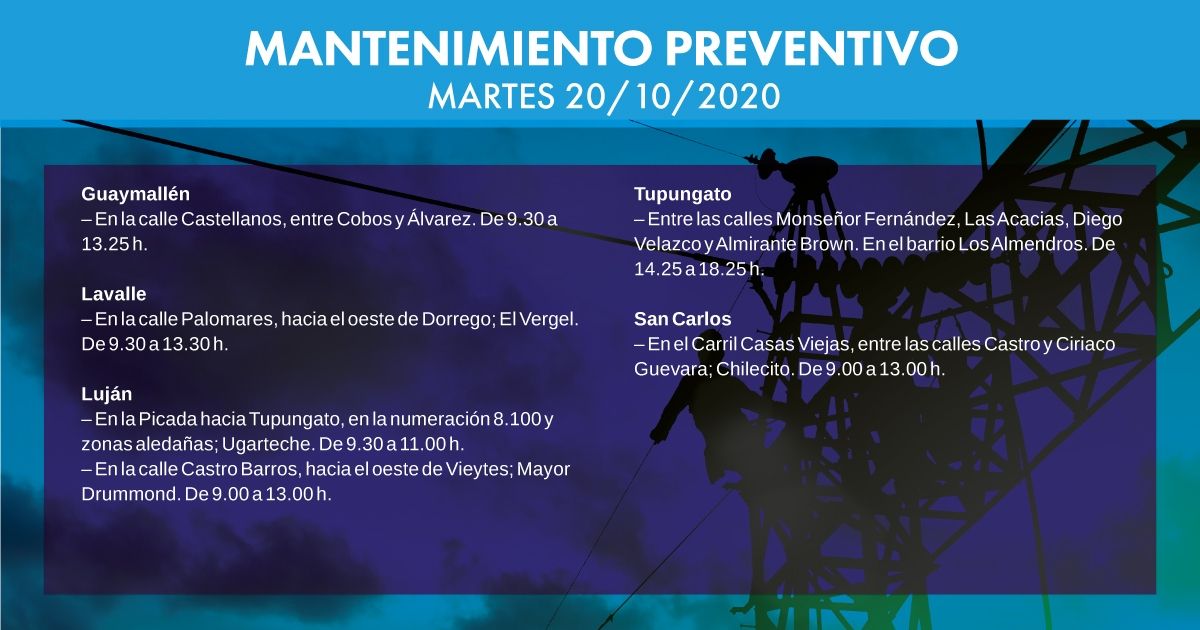 Hoy habrá afectación del servicio eléctrico en las siguientes zonas y horarios. Estas tareas de Edemsa se realizan bajo los protocolos sanitarios establecidos por el covid-19.