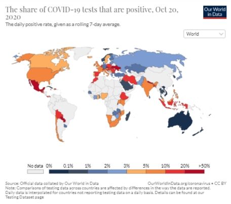 Edouard Mathieu, administrador de Datos de la base Our World in Data -un sitio de la Universidad de Oxford-, explicó en Twitter que, según surge de esta nota de Clarín, “muchas pruebas negativas no fueron registrándose en varias provincias” lo que “sesga la tasa positiva hacia arriba, hasta un asombroso 75% en la actualidad”.