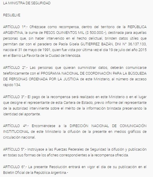 El ofrecimiento del Ministerio de Seguridad, que lleva la firma de la ministra Sabina Frederic, fue publicado en el Boletín Oficial de este lunes. La resolución 389/2020 establece que "quienes quieran suministrar datos sobre el paradero de la joven deberán comunicarse telefónicamente con el Programa Nacional de Coordinación para la Búsqueda de Personas Ordenada por la Justicia del Ministerio de Seguridad al número de acceso rápido 134".