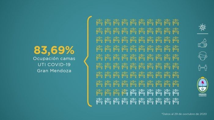 El Ministerio de Salud de Mendoza publicaron el informe semanal de la situación de la pandemia del coronavirus en la provincia. En cuanto al factor ocupacional de las camas de la Unidad de Terapia Intesiva, el Gran Mendoza es del 83,69% y el 80% en todo el territorio mendocino.