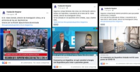 Por otro lado, RedDES pudo comprobar que a principios de agosto la página oficial de Facebook de Fundación Respirar -que brinda tratamientos para enfermedades respiratorias crónicas- comenzó a publicar varios posteos relacionados con el ibuprofeno inhalado. El director de la fundación es el doctor Alexis Doreski, quien está a cargo del proyecto cordobés “Ibuprofeno inhalado” en Buenos Aires.