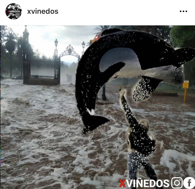 También con la foto de la intersección de Emilio Civit y Boulogne Sur Mer inundada de fondo, superpusieron la archiconocida imagen de la película "Liberen a Willy": seguramente un meme que entenderán mejor quienes ya peinan alguna cana.