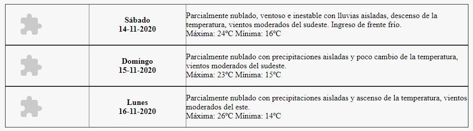 Este sábado, según Contingencias Climáticas, estará "parcialmente nublado, ventoso e inestable con lluvias aisladas, descenso de la temperatura, vientos moderados del sudeste". Además, habrá "un ingreso de frente frío".