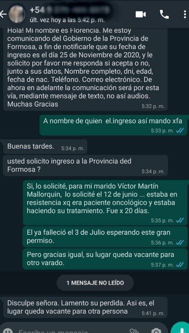 Lo insólito es que el viernes pasado, cinco meses después de haber solicitado el acceso, la viuda de Mallorquín, Itatí Decoud, recibió la autorización para que su marido regrese a la provincia por parte del Gobierno de Formosa. La mujer contó en redes sociales su sorpresa y su decepción por haber recibido ese mensaje tras la muerte de su marido.