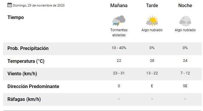 Se esperan una mínima de 20°C y una máxima de 28°C. Todo el día estará parcialmente nublado y sin probabilidades de lluvias ni tormentas.