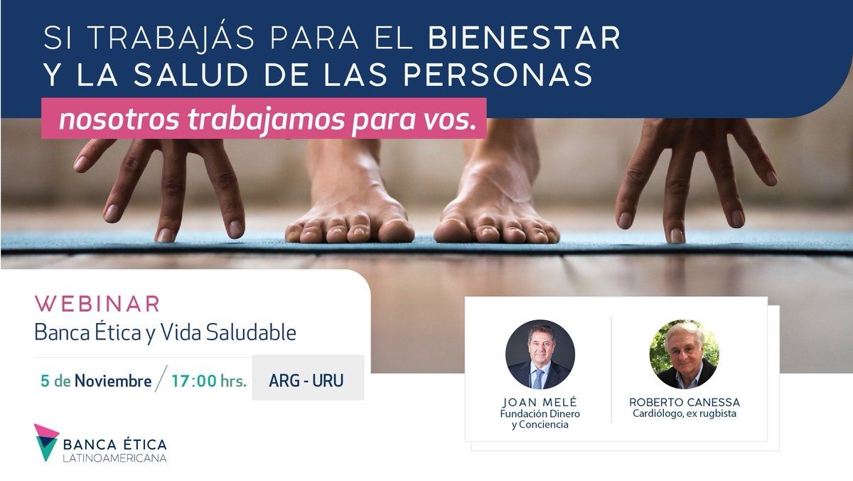 El próximo jueves 5 de noviembre a las 17 hrs (ARG/URU) Banca Ética realizará el seminario virtual “Banca Ética y Vida Saludable”. En esta oportunidad, Joan Melé, presidente de la Fundación Dinero y Conciencia, y Roberto Canessa, cardiólogo, ex jugador de rugby y sobreviviente de la tragedia de Los Andes, conversarán sobre la importancia de desarrollar una vida saludable como parte del bienestar integral de la población.