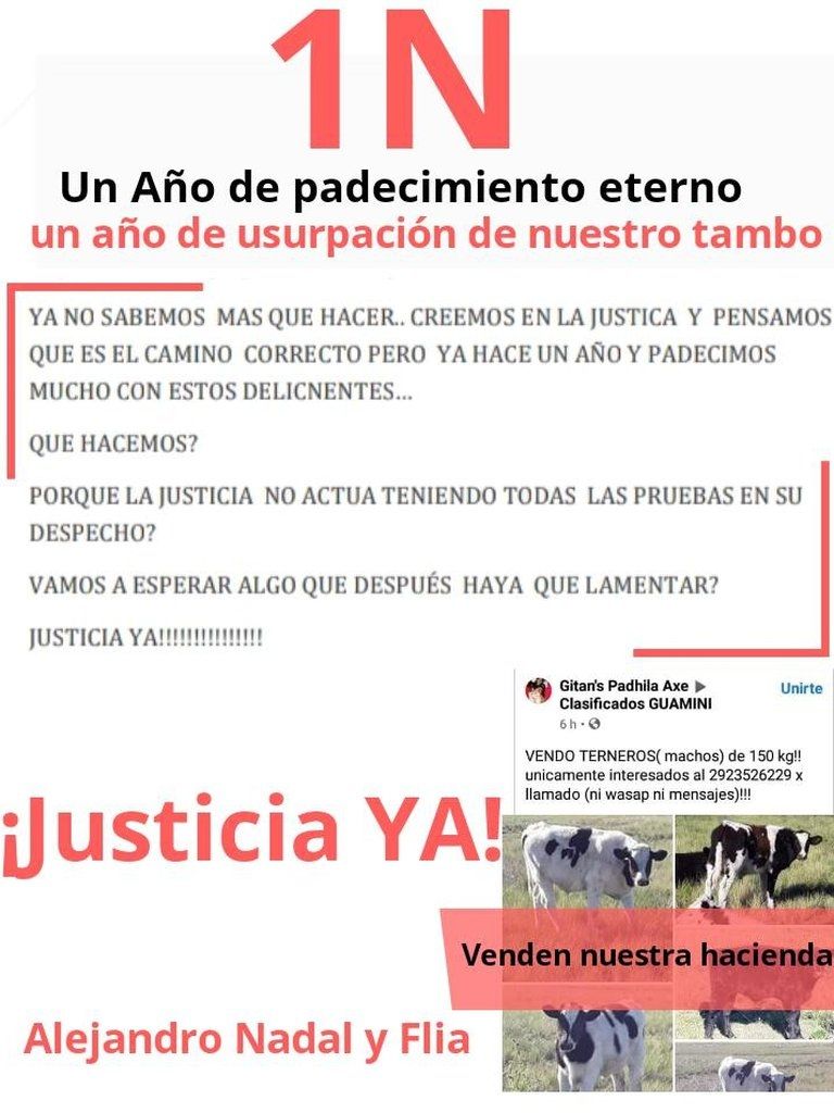 Pese la toma, la pareja continúa abonando el alquiler del campo pero “los usurpadores siguen explotando el tambo y vendiendo nuestras pertenencias”. “Hay un anuncio de desalojo en la Justicia bonaerense en contra de ellas, emitido el 27 de septiembre, pero todo sigue igual”, remarcaron los productores rurales.