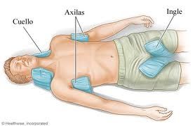 Se debe actuar en forma inmediata. En primer lugar, colocar a la persona en un lugar fresco, bajo sombra. Luego sacarle la ropa e hidratarla. Posteriormente intentar bajar la temperatura con paños de agua. Se recomienda colocar agua con hielo en un recipiente y sumergir toallas, las cuales serán escurridas y colocadas en axilas e ingle (ambos lados). Luego ir rotando y refrescando las toallas para así bajar la temperatura.
