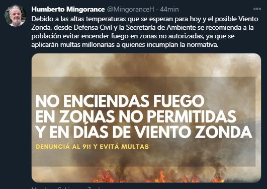 "Debido a las altas temperaturas que se esperan para hoy y el posible viento Zonda, desde Defensa Civil y la Secretaría de Ambiente se recomienda a la población evitar encender fuego en zonas no autorizadas, ya que se aplicarán multas millonarias a quienes incumplan la normativa", advirtió el secretario de Ambiente, Humberto Mingorance, a través de su cuenta de Twitter.