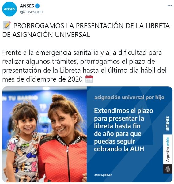 Por la pandemia de coronavirus, la Administración Nacional de Seguridad Social (Anses) extendió el plazo para presentar la Libreta de Asignación Universal hasta el 31 de diciembre y además habilitó que se pueda presentar de manera online.