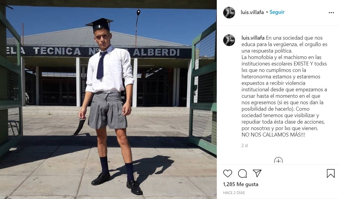 "La homofobia y el machismo en las instituciones escolares existe, todxs lxs que no cumplimos con la 'heteronorma' estamos y estaremos expuestxs a recibir violencia institucional desde que empezamos a cursar hasta el momento en el que nos egresamos", dijo en sus cuentas de Facebook e Instagram el estudiante Luis Villafañe.
