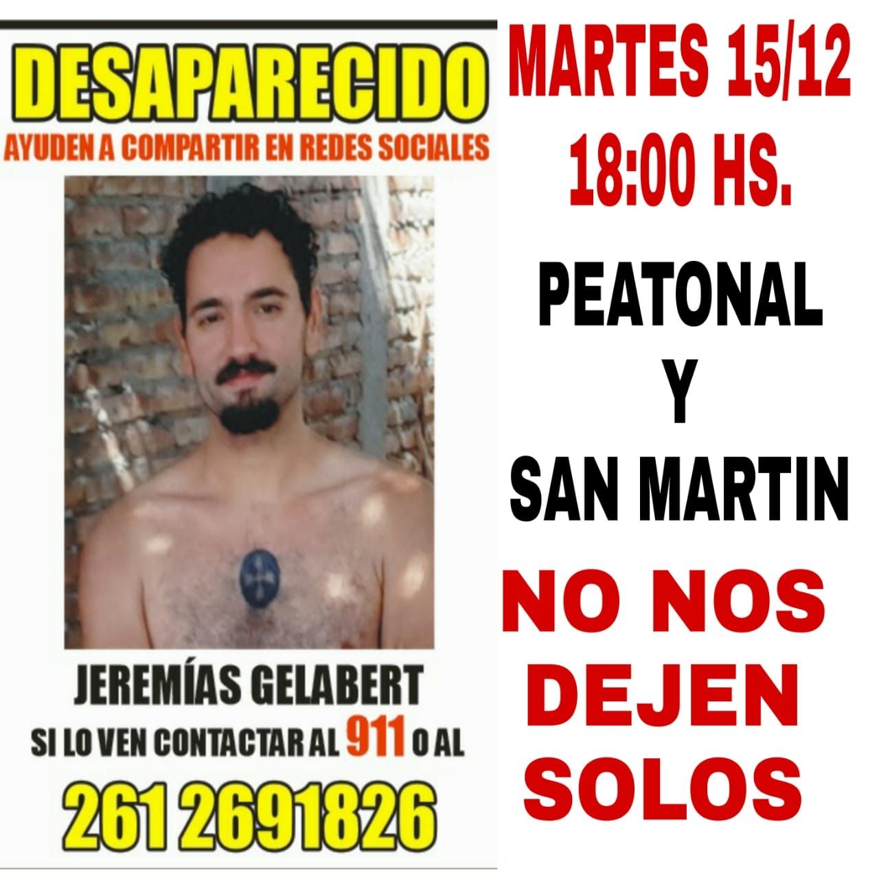 Ante las pocas novedades y la creciente desesperación, familiares y amigos de Jeremías Gelabert están convocando a una manifestación para este martes 15 de diciembre a las 18 horas en Peatonal y San Martín. La intención de los organizadores es que se siga difundiendo la búsqueda del joven y que las autoridades redoblen sus esfuerzos para encontrar al menos un dato certero sobre él.
