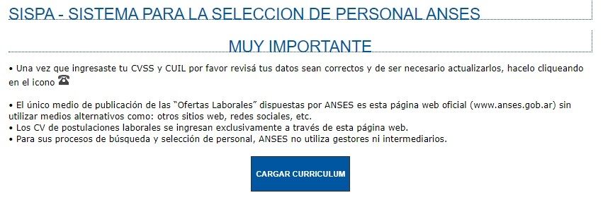 Allí se especifica que "el único medio de publicación de las “Ofertas Laborales” dispuestas por ANSES es esta página web oficial (www.anses.gob.ar) sin utilizar medios alternativos como: otros sitios web, redes sociales, etc. Además especifican que los CV de postulaciones laborales se ingresan exclusivamente a través de esta página web. Finalmente, aclaran que para sus procesos de búsqueda y selección de personal, ANSES no utiliza gestores ni intermediarios.