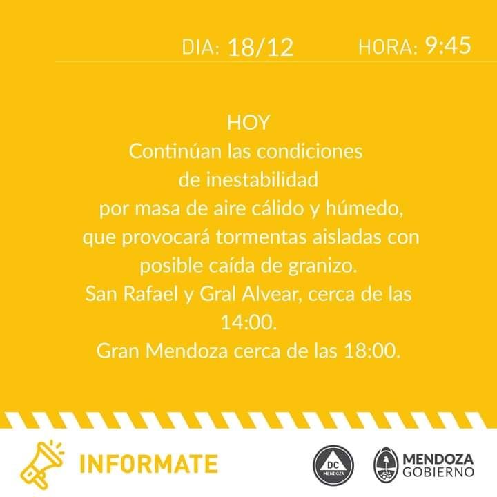 "San Rafael y General Alvear cerca de la 14. Gran Mendoza cerca de las 18", asegura el alerta emitido por el organismo provincial, que guarda relación con lo expresado en el pronóstico de la Dirección de Contingencias Climáticas de la provincia.