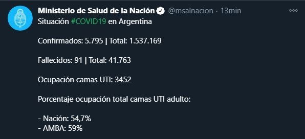 Hoy fueron confirmados por el Ministerio de Salud de la Nación, 5.795 nuevos casos de covid-19. Con estos registros, suman 1.537.169 positivos en el país, de los cuales 1.362.617 son pacientes recuperados y 132.789 son casos confirmados activos.