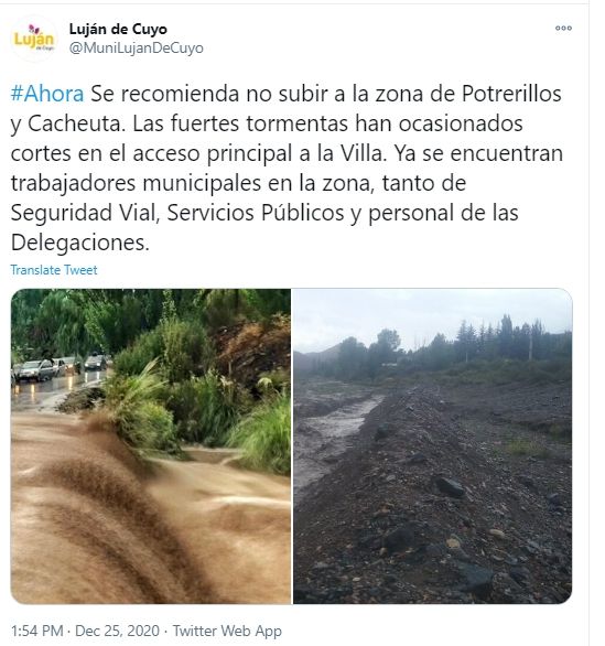 Desde la Municipalidad de Luján de Cuyo alertaron sobre la situación meteorológica en Alta Montaña y recomendaron no subir a la zona de Potrerillos y Cacheuta debido a que las fuertes tormentas han ocasionados cortes de accesos.