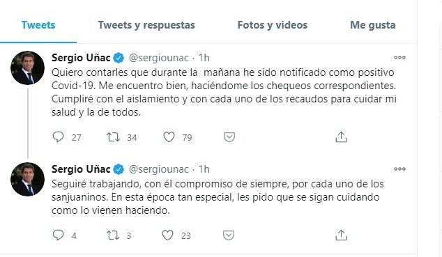Según informó Diario de Cuyo y como se pudo saber en la cuenta oficial de Twitter de Sergio Uñac, gobernador de la provincia de San Juan, esta mañana le confirmaron al mandatario estar infectado de covid-19.