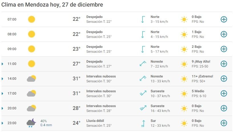 El Servicio Meteorológico Nacional pronosticó para Mendoza un domingo con una mínima de 19° C y una máxima de 33° C. Además, se anuncia una mañana mayormente nublada, mientras que por la tarde llegarán tormentas fuertes que podrían durar hasta la noche.