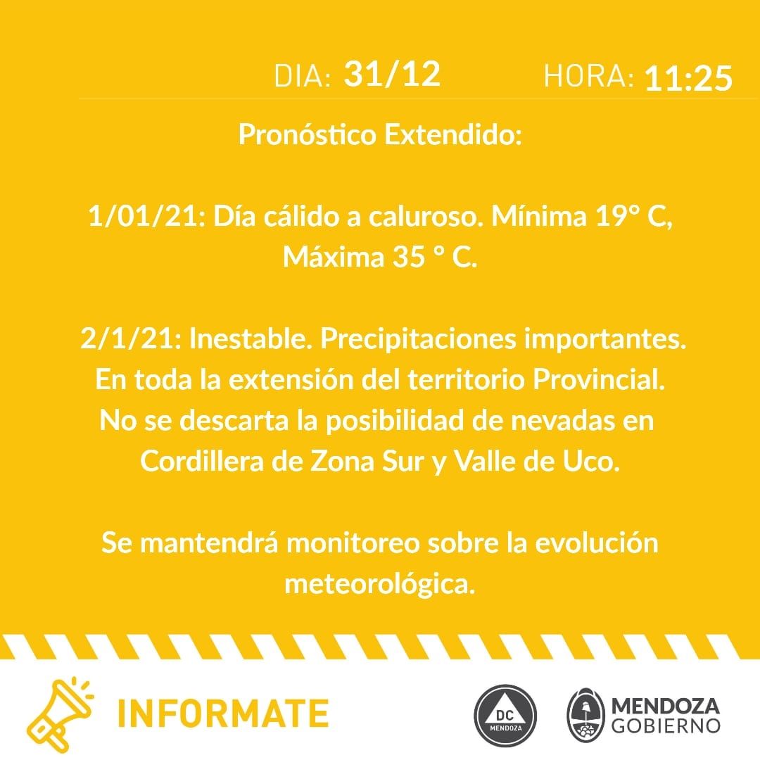 Además, desde el Gobierno alertaron que el sábado 2 de enero estará muy inestable y se esperan "precipitaciones importantes en toda la extensión del territorio provincial".