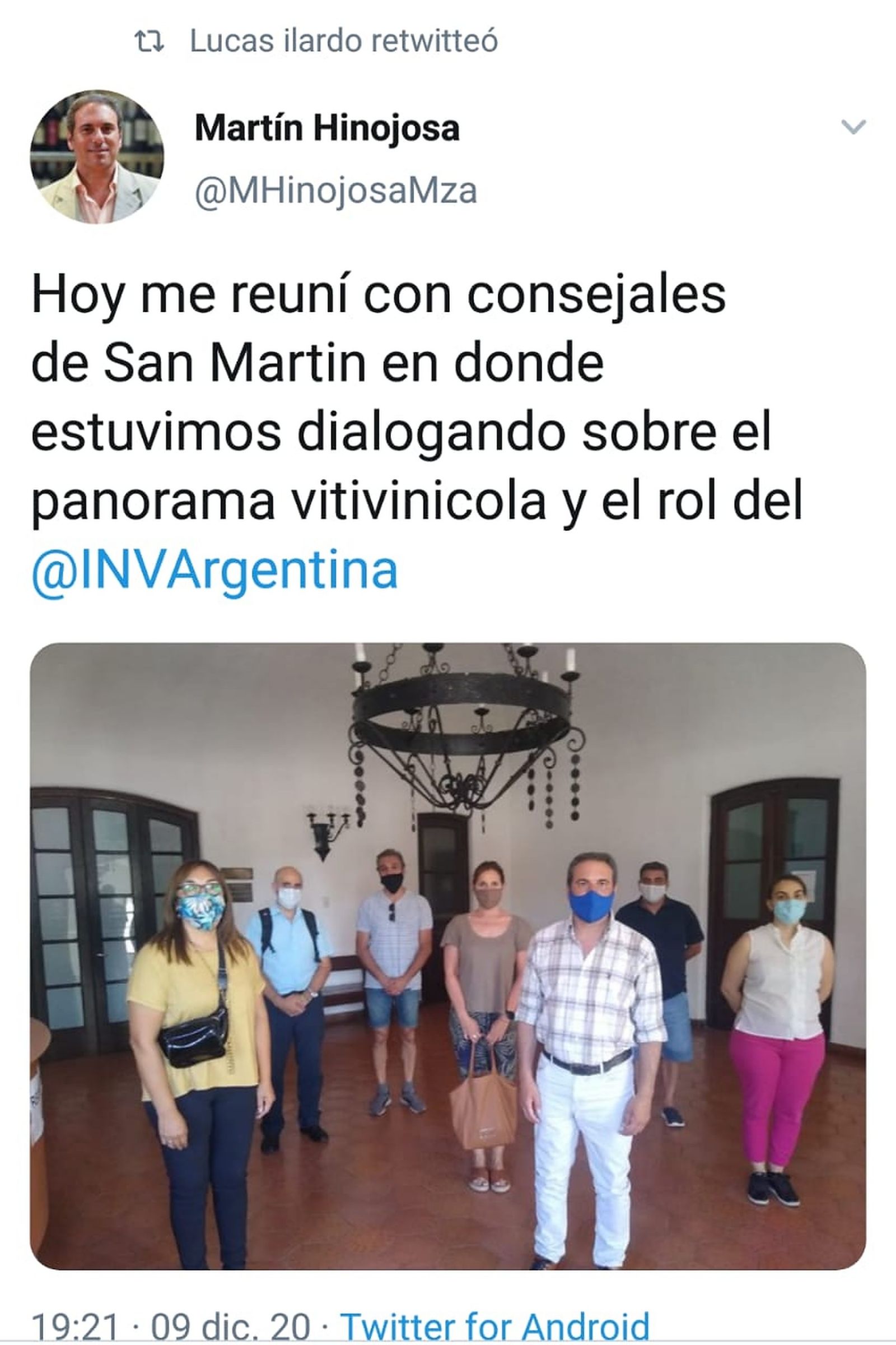 El presidente del Instituto Nacional de Vitivinicultura (INV), Martín Hinojosa, quiso contar hace minutos que se había reunido con concejales del departamento de San Martín para conversar sobre la realidad vitivinícola y el rol de la entidad que conduce. Para hacerlo utilizó las cinco líneas que admite un tuit. Pero fue suficiente para cometer tres errores ortográficos.