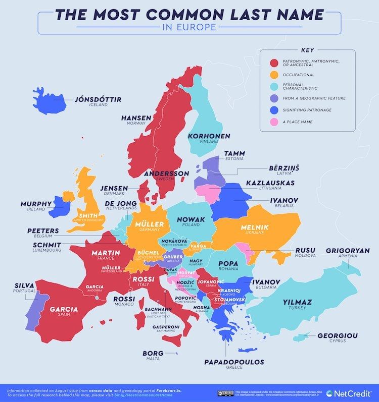 El mapa de NetCredit muestra que el apellido más común en Alemania es Müller, el nombre ocupacional de un molinero. En los países de habla inglesa, incluidos EE. UU., Canadá, Australia y el Reino Unido, el apellido más común es Smith, un nombre que se utilizó por primera vez para las personas que eran herreros.