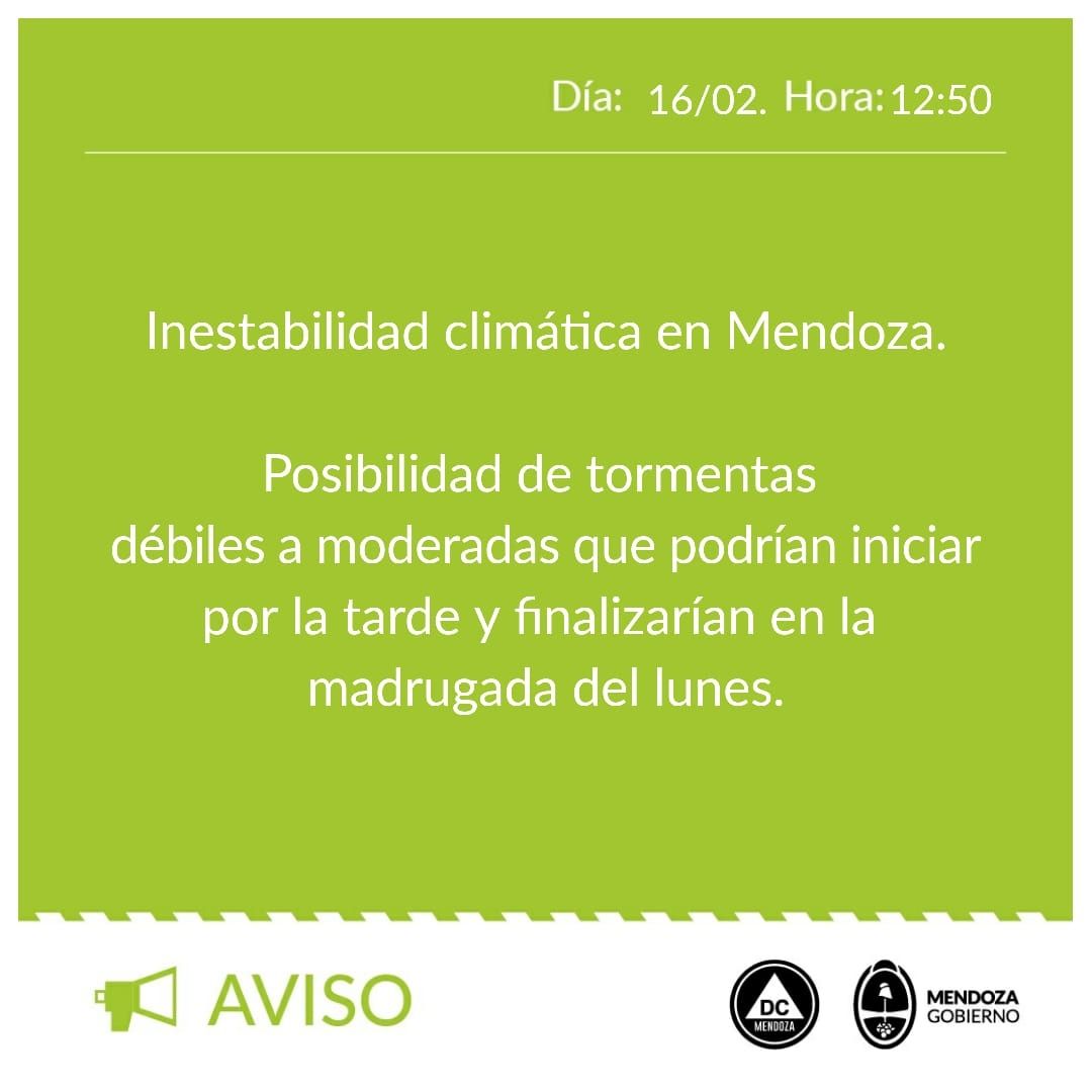 "Inestabilidad climática en Mendoza. Posibilidad de tormentas débiles a moderadas que podrían iniciar por la tarde y finalizaría en la madrugada del lunes", indica el aviso publicado por Defensa Civil.
