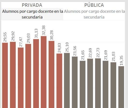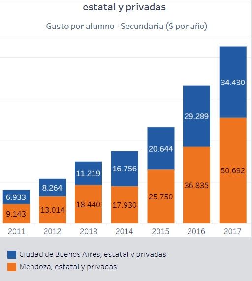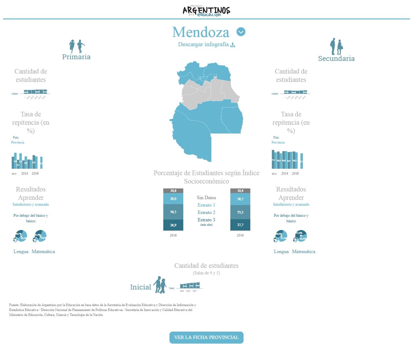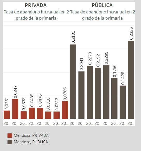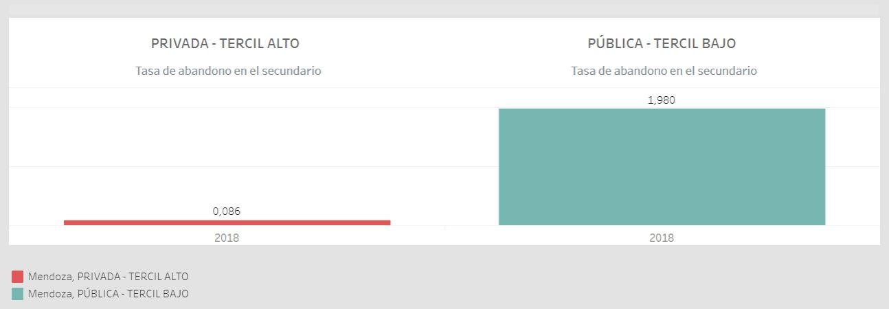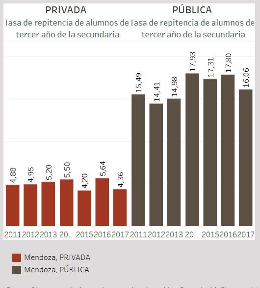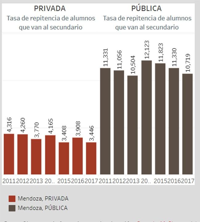 En Mendoza existen grandes diferencias entre la educación pública y privada. en los ciclos primario y secundario, .Por ejemplo, en alumnos de cuarto año (secundaria), la proporción de repetidores en los establecimientos públicos casi triplica al de los privados, mientras que -también en educación secundaria- la diferencia entre los que abandonan en la franja social baja de escuelas públicas respecto de la franja social alta de secundarios privados es 22 a 1. Se trata de datos abiertos que publica el Observatorio Argentinos por la Educación. Haciendo clic aquí ingresá al interactivo con datos de la educación pública y privada de Mendoza.