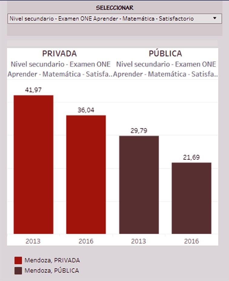 Aprendizaje. También se advierten grandes diferencias entre educación pública y privada y segmentos sociales. El porcentaje de alumnos mendocinos del tercil alto en secundarios privados con resultado satisfactorio en Matemáticas en el examen Aprender 2016 fue 37,1% (35,4% en los estatales) y 12,9% en alumnos del tercil bajo en secundarios públicos.