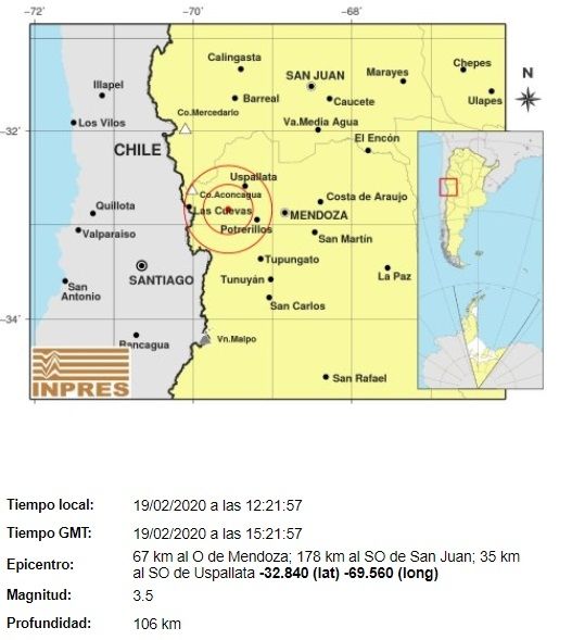El movimiento se registró, según datos del Inpres, a las 12.21, en la zona de montaña de la provincia, y registró una intensidad de 3,5º Richter.