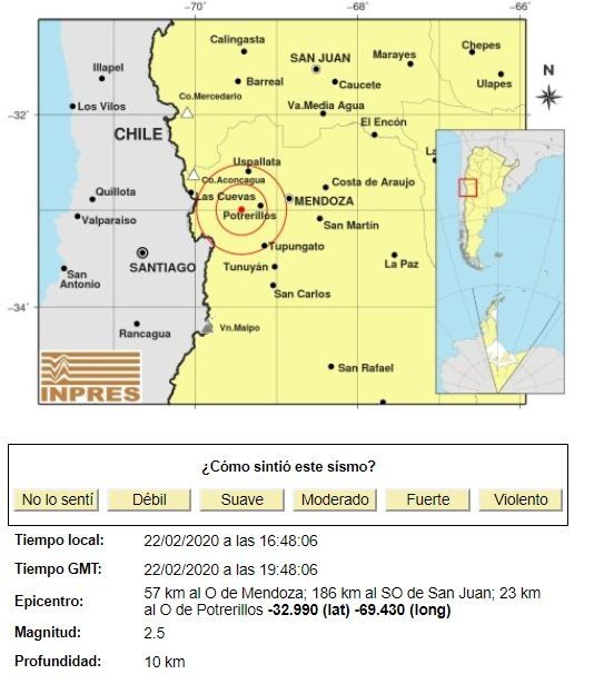 La magnitud del sismo fue de 2,5 en la escala Ritcher y se produjo a las 16:48. Si bien casi pasó desapercibido para todos los mendocinos, el epicentro estuvo ubicado a 57 km al O de Mendoza; 186 km al SO de San Juan; 23 km al O de Potrerillos. La profundidad fue de 10 km.