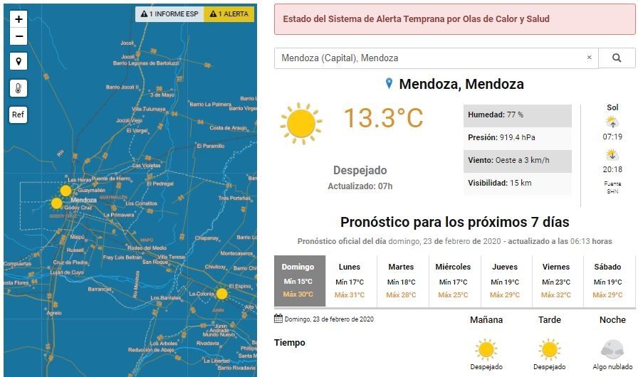 El lunes feriado, en tanto, subirá algo más la máxima, alcanzando los 33 grados. "Caluroso con nubosidad variable y tormentas aisladas hacia la noche, vientos moderados del sector sur durante la tarde. Lloviznas en cordillera al final del día y siguiente madrugada", resalta el informe de Contingencias.