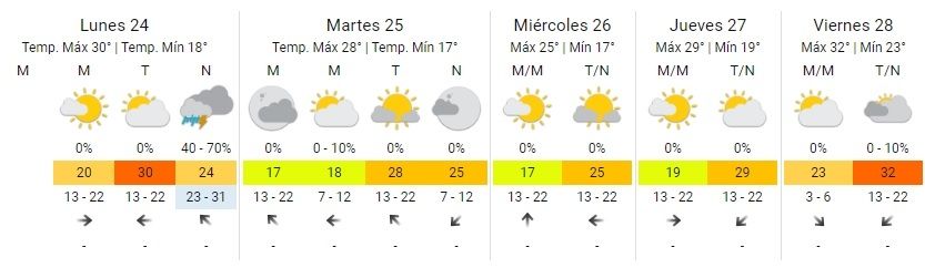 El miércoles, en tanto, se espera el día más fresco de la semana, ya que la mínima rondaría los 17º, y la máxima no pasará de 25º.