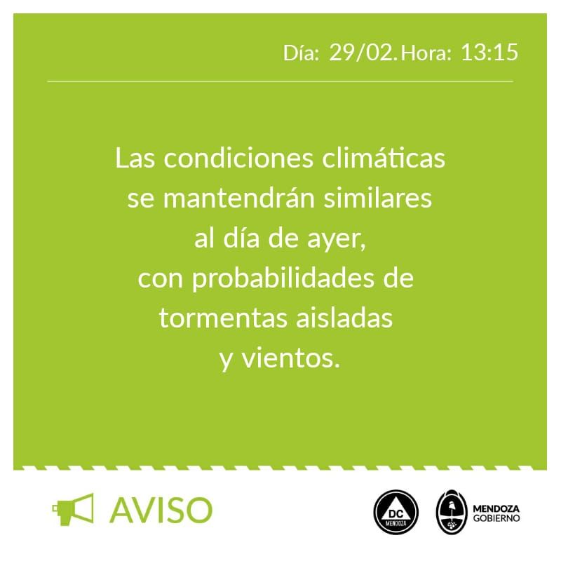Defensa Civil emitió un comunicado este sábado informando que "las condiciones climáticas se mantendrán similares a las del día viernes, con probabilidades de tormentas aisladas y vientos".