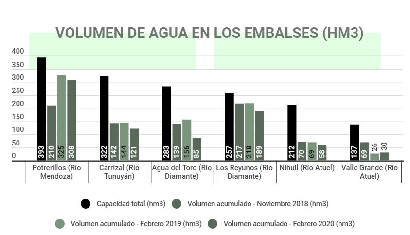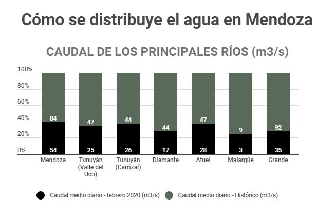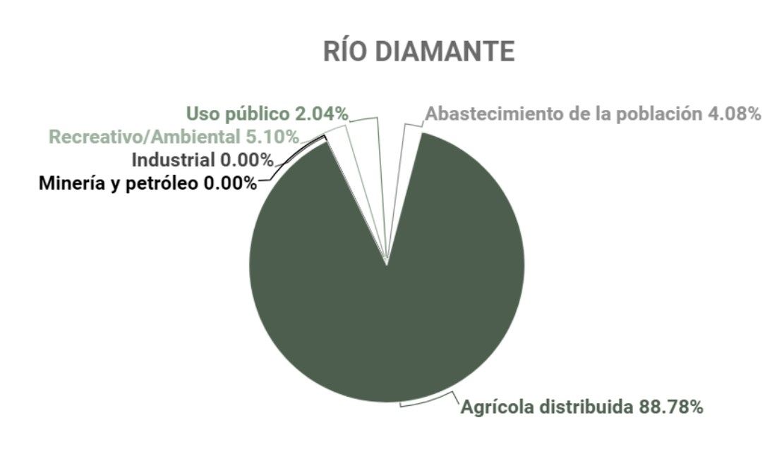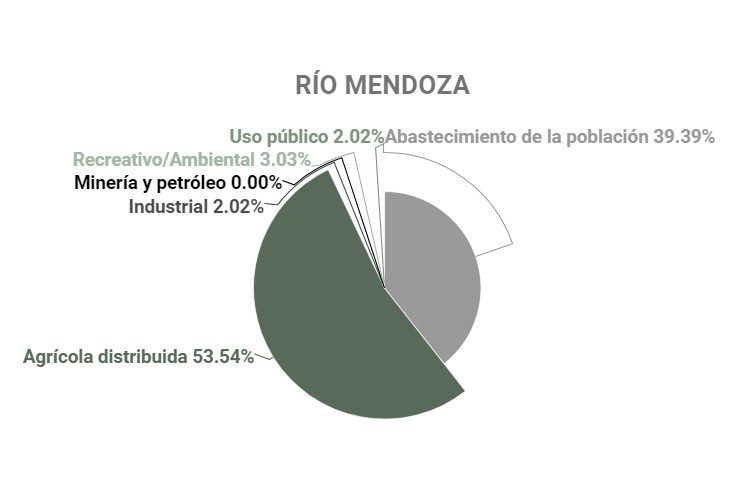 Los ríos que más agua destinan para abastecer a la población son el Mendoza (39,2% de su caudal), Diamante (4,8% de su total), Malargüe (1,5%) y Atuel (1,3%). Y para el uso recreativo y ambiental va el 31,2% del río Malargüe, el 5,1% del Diamante, 3,2% del río Mendoza, 1,4% del río Tunuyán y 0,6% del Atuel.