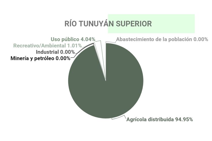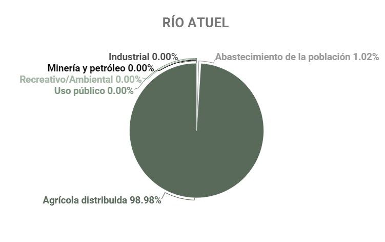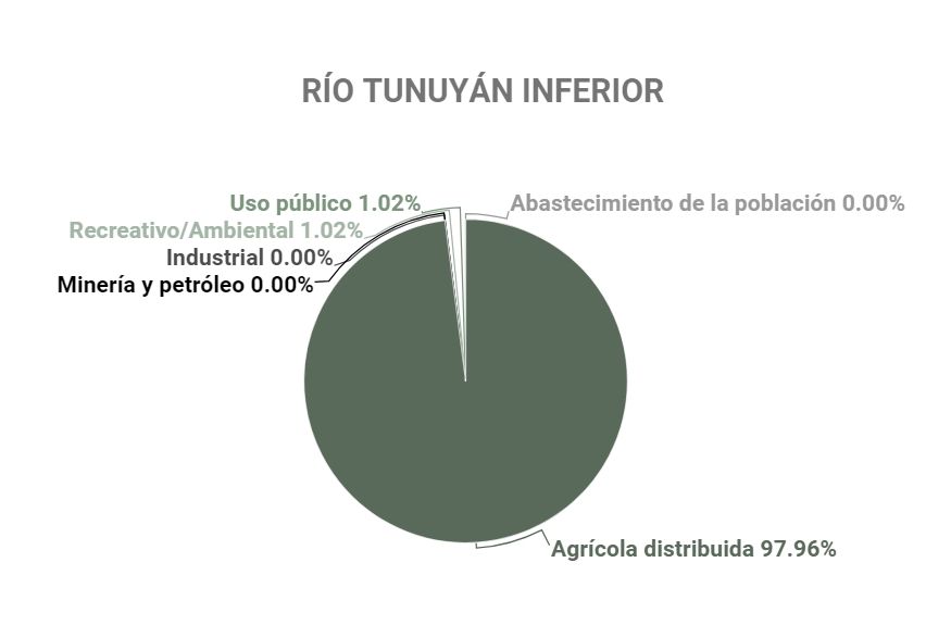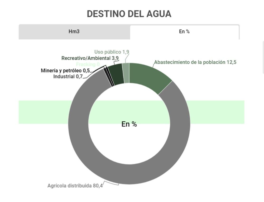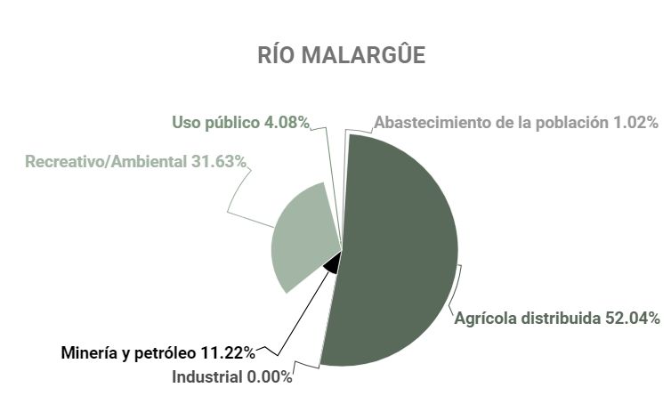 ¿Cuánta agua de los ríos consume la industria en la provincia? Sólo el 1,2% se lo llevan la industria, minería y el petróleo. Y difieren según las cuencas hídricas: para la minería solo se destina del agua del río Malargüe el 11,4% del total de esa cuenca y el 0,1% del río Tunuyán superior, mientras que el sector agrícola se lleva la mitad del agua del río Malargüe y el 94,1% del Tunuyán superior. Para el abastecimiento humano se destina el 1,5% del río Malargüe. Según datos de Irrigación, nada de los ríos Mendoza, Atuel, Diamante y Tunuyán inferior abastece a la minería.