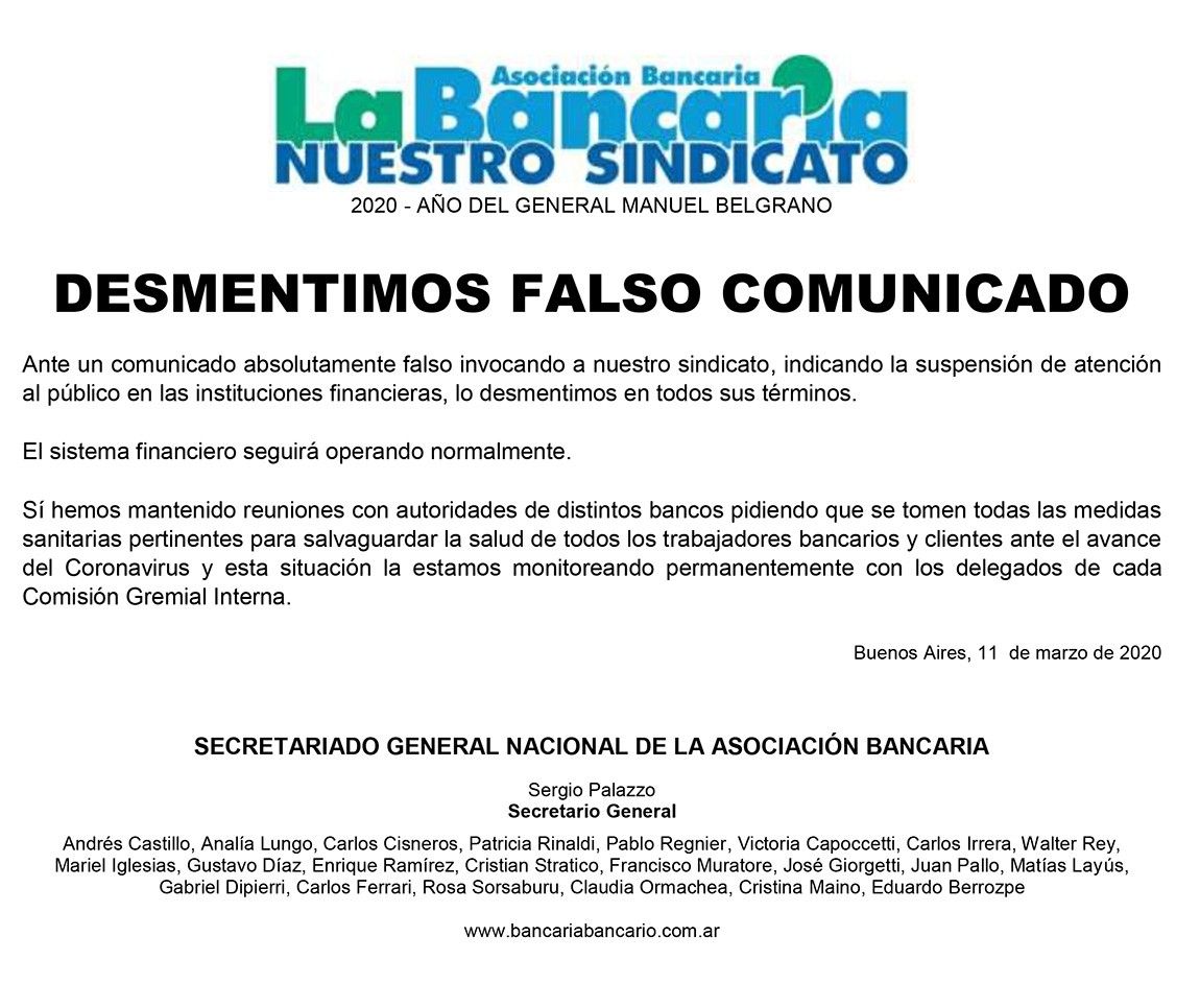 "Ante un comunicado absolutamente falso invocando a nuestro sindicato indicando la suspensión de atención al público en las instituciones financieras lo desmentimos en todos sus términos", señaló Berrozpe a través de un comunicado.