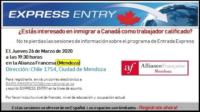 La charla que se llevará a cabo en la sede de la Alianza Francesa (Chile 1754, Ciudad de Mendoza), será con entrada gratuita y previa inscripción por email a [email protected] escribiendo EXPRESS ENTRY en la línea de asunto, para que la Embajada canadiense evalúe si el perfil del interesado reúne varios requisitos que deben consignarse en el cuerpo del correo, como el nivel de francés (uno de los idiomas oficiales de Canadá), nivel de educación y ocupación actual.