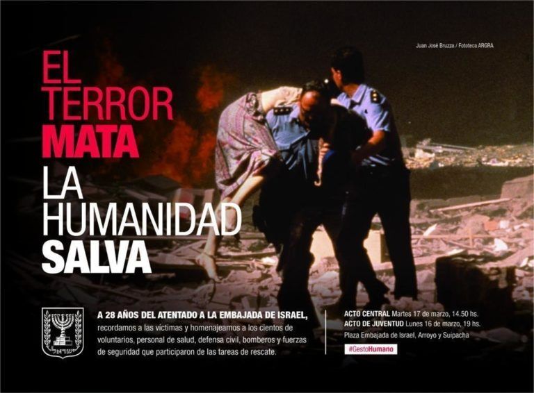 El mensaje principal dice "El terror mata. La humanidad salva", con ambas frases una junto a otra en colores negro y blanco, respectivamente, con fondo negro. Debajo de esa leyenda expresa: "A 28 años del atentado a la Embajada de Israel recordamos a las víctimas y homenajeamos a los cientos de voluntarios, personal de salud, Defensa Civil, bomberos y fuerzas de seguridad que participaron en las tareas de rescate", informó la Agencia Judía de Noticias (AJN).
