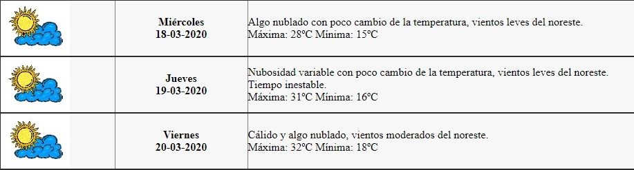 “Algo nublado con poco cambio de la temperatura, vientos leves del noreste. Máxima 28ºC y Mínima: 15ºC”, es el pronóstico de la Dirección de Contingencias Climáticas para este miércoles.