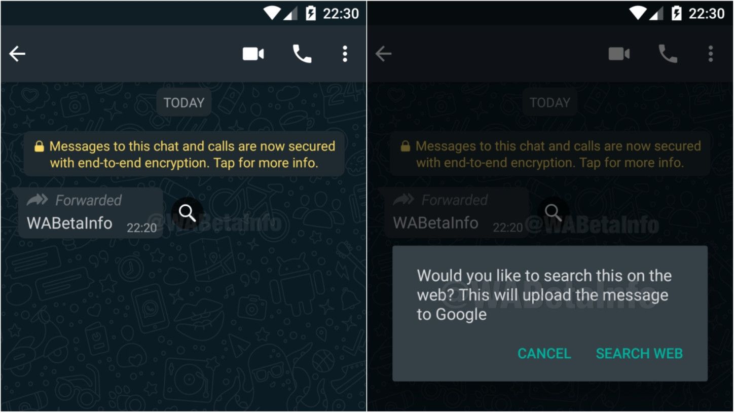 En esta oportunidad se conoció que se está trabajando en una función que les permitirá a los usuarios buscar en internet los mensajes que han recibidos y así poder comprobar su veracidad. La opción se llama "buscar mensajes en la web" y está instalada en la versión beta de Whatsapp ya que está siendo probada por algunos privilegiados usuarios en el mundo.